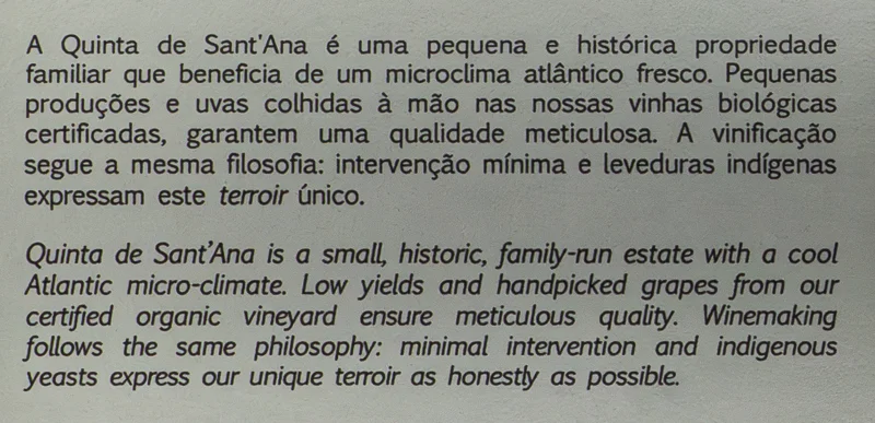 Odroda Fernão Pires dodáva tomuto vínu váhu a objem v ústach, zatiaľ čo odroda Arinto vyrovnáva kyslosť a citrusové chute so štruktúrou vyzrievania v dreve.